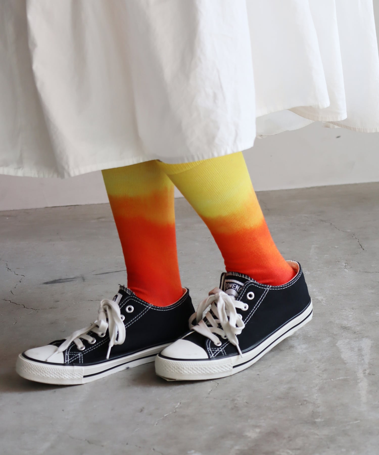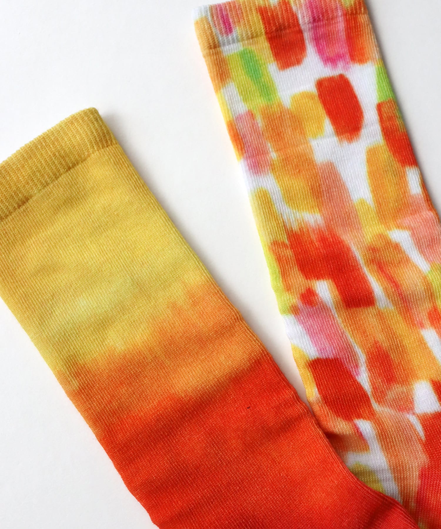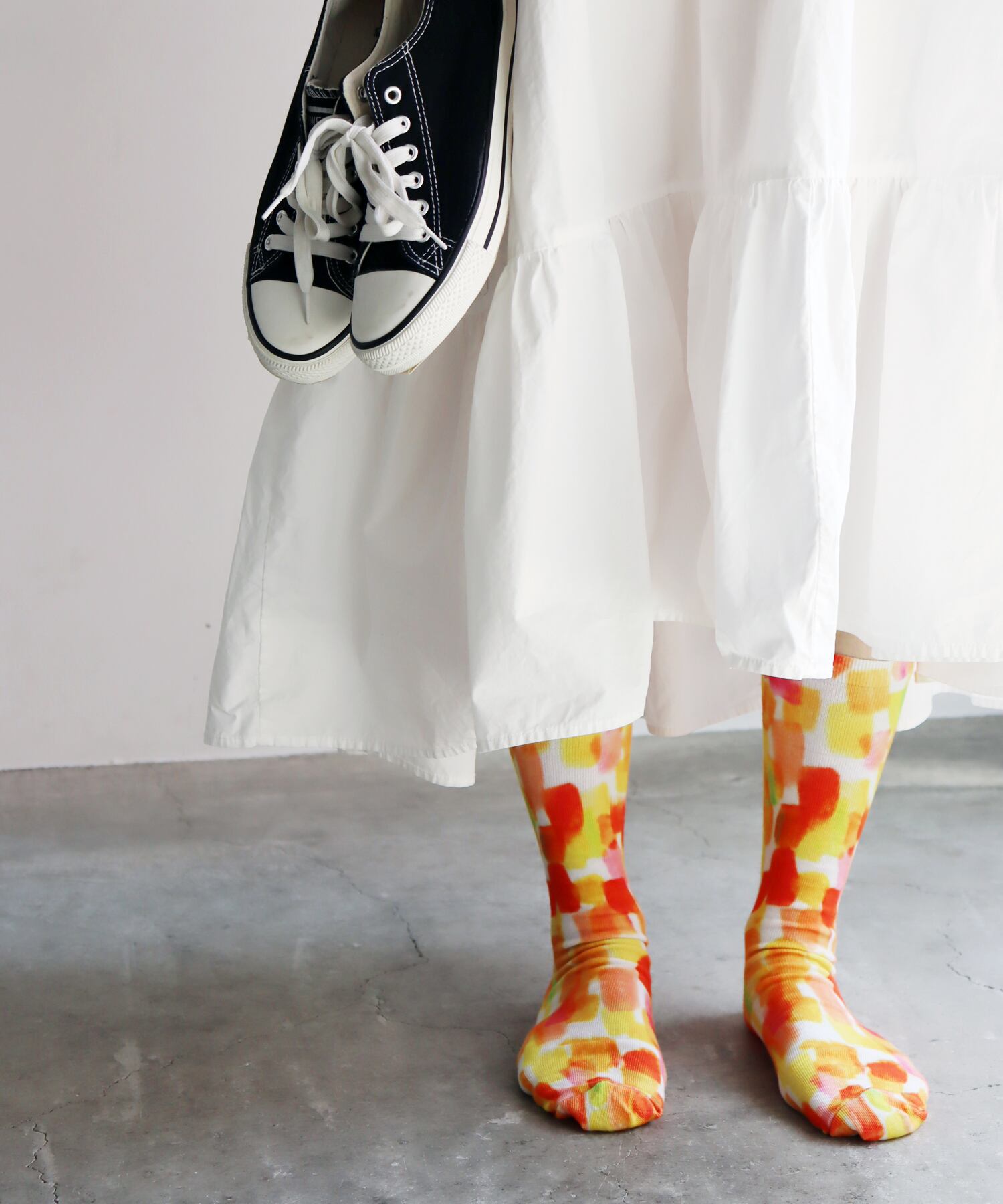 夕陽で染め上げたような、アートな総柄プリントソックス。