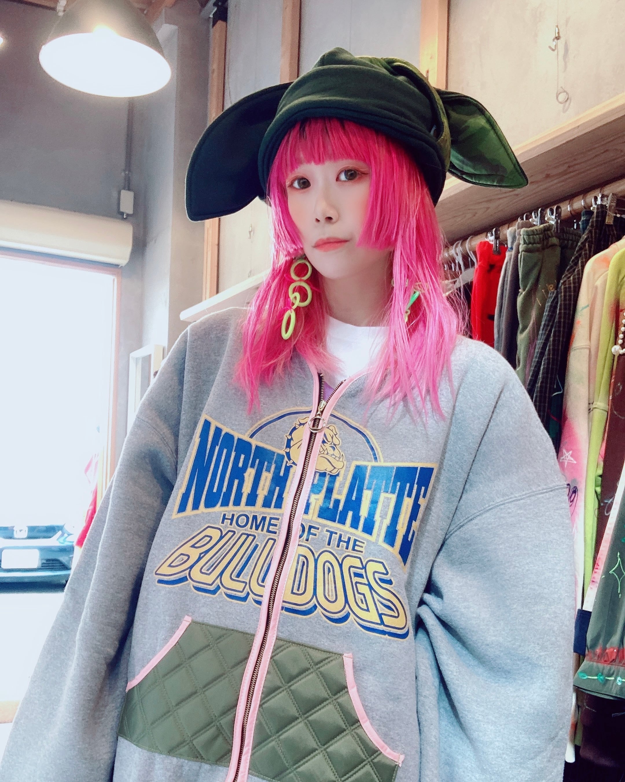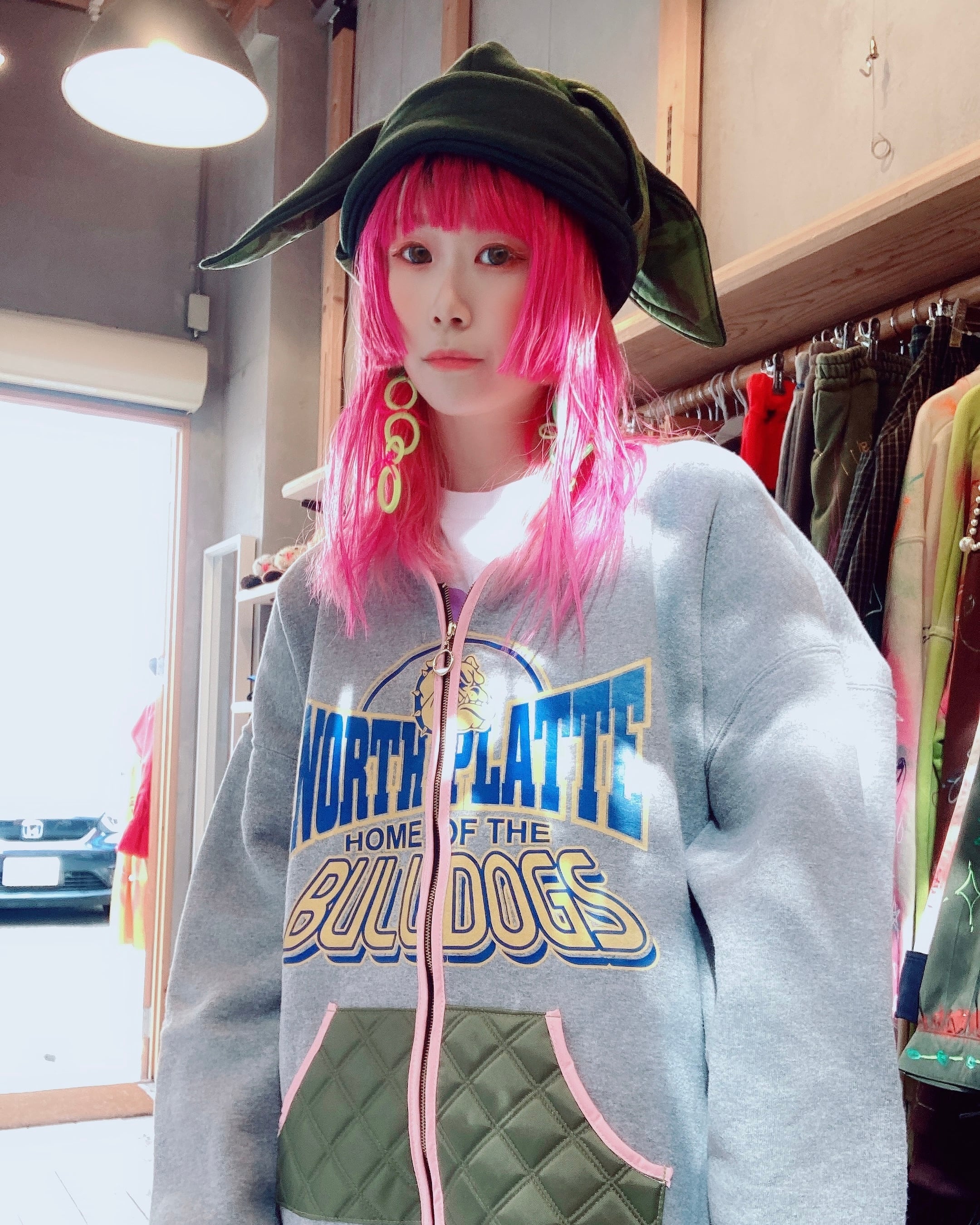 カーキのスウェット×キルト素材で、